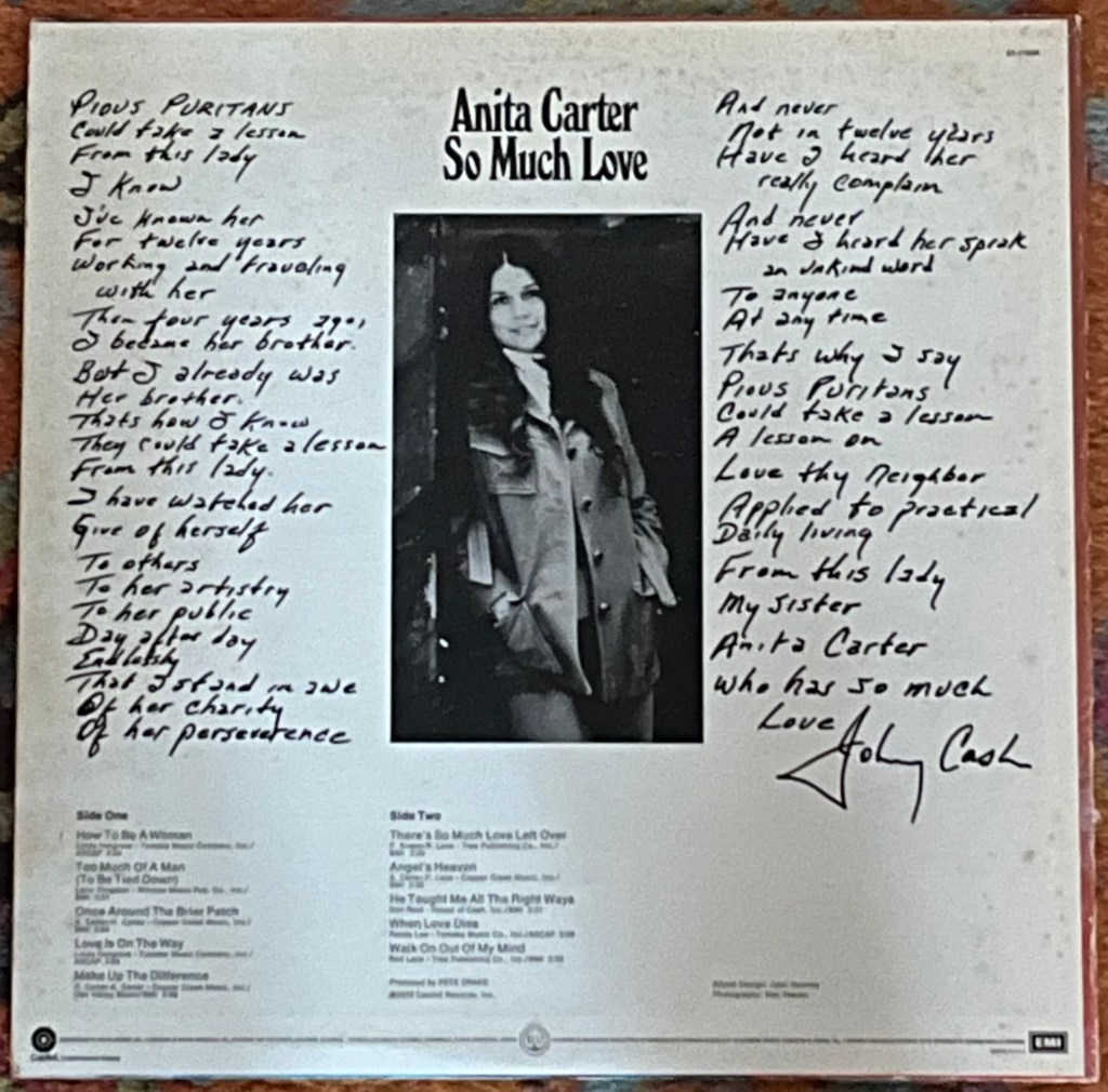 Anita didn’t record many solo albums throughout her career. But she had lots of support for So Much Love. Unfortunately, the session players and singers who joined her for the album are not noted on the LP. One person we know who helped, though, is Johnny Cash, who supplied the liner notes. He wrote: